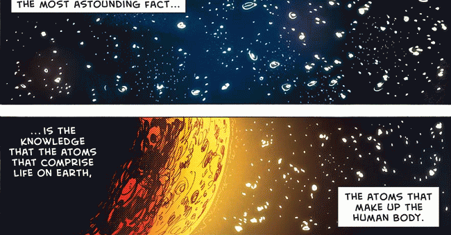 Ο γνωστός και συμπαθέστατος Νηλ Ντεγκράς Τάισον, που θα παρουσιάσει και το πολυαναμενόμενο καινούριο Cosmos σε λίγους μήνες, έχει δώσει μια πολύ ωραία απάντηση σε δημοσιογράφο, όταν ρωτήθηκε ποιο είναι το πιο εκπληκτικό γεγονός που γνωρίζει, ως αστροφυσικός. Την έχεις ξαναδεί εδώ σε δύο βιντεοεκδοχές. Αλλά το zenpencils.com την έχει κάνει και αυτή κόμιξ (όπως το Pale Blue Dot). Καλή ανάγνωση.Κάνε αν θέλεις μια βόλτα από το zenpencils.com να διαβάσεις και άλλα κόμιξ, έχει κάμποσα σχετικά με επιστήμη.