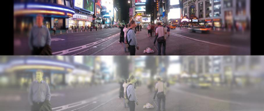 Πρόσεξε το ευρύτερο οπτικό πεδίο (δεν έχει μαύρες μπάρες στις άκρες) αλλά και την ευρύτερη περιφερειακή όραση (λιγότερη θολούρα στα πλάγια). Εννοείται πως δίνεται έμφαση στα κινούμενα αντικείμενα, ενώ η καημένη αδυνατεί να ανιχνεύσει κόκκινα.